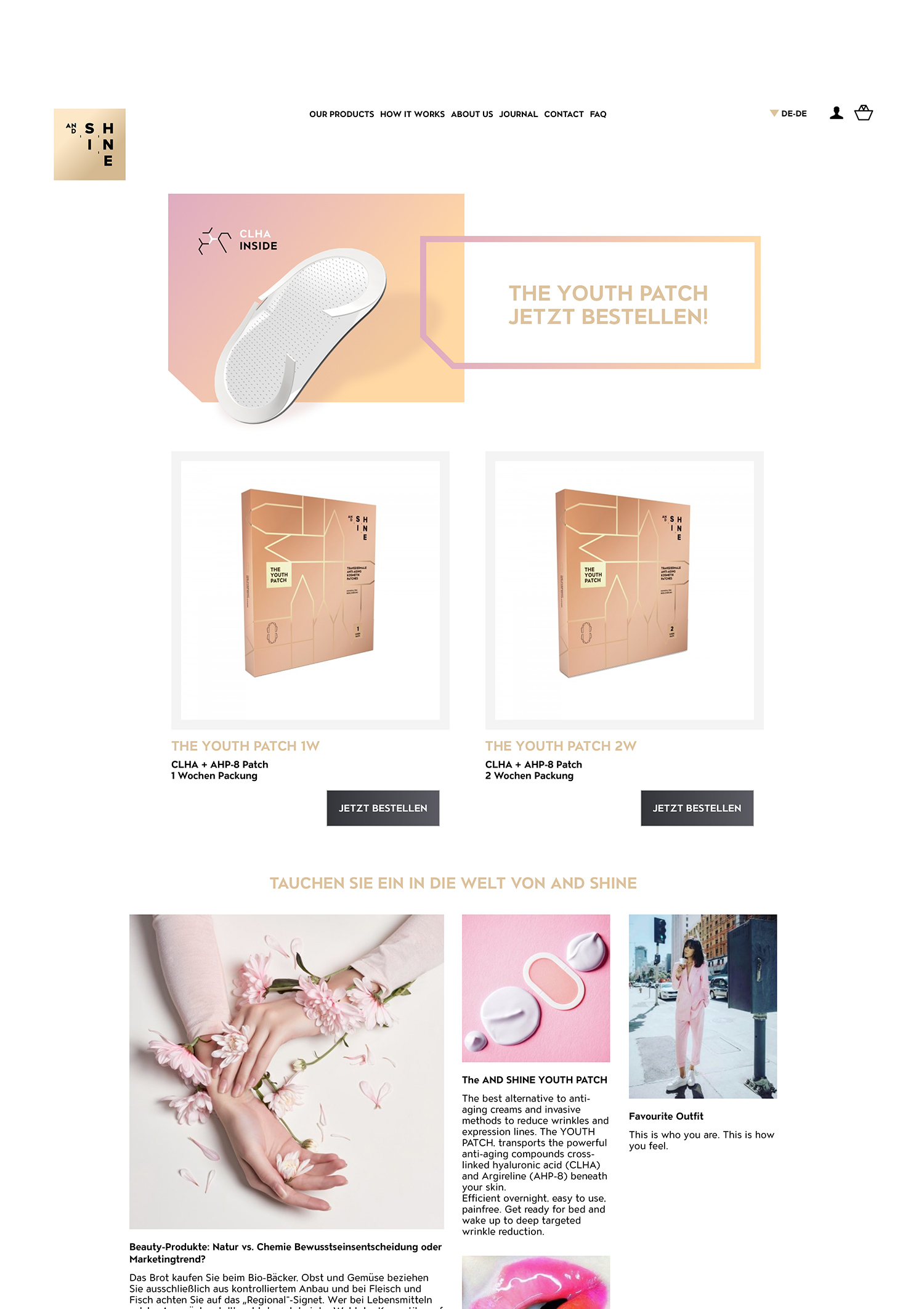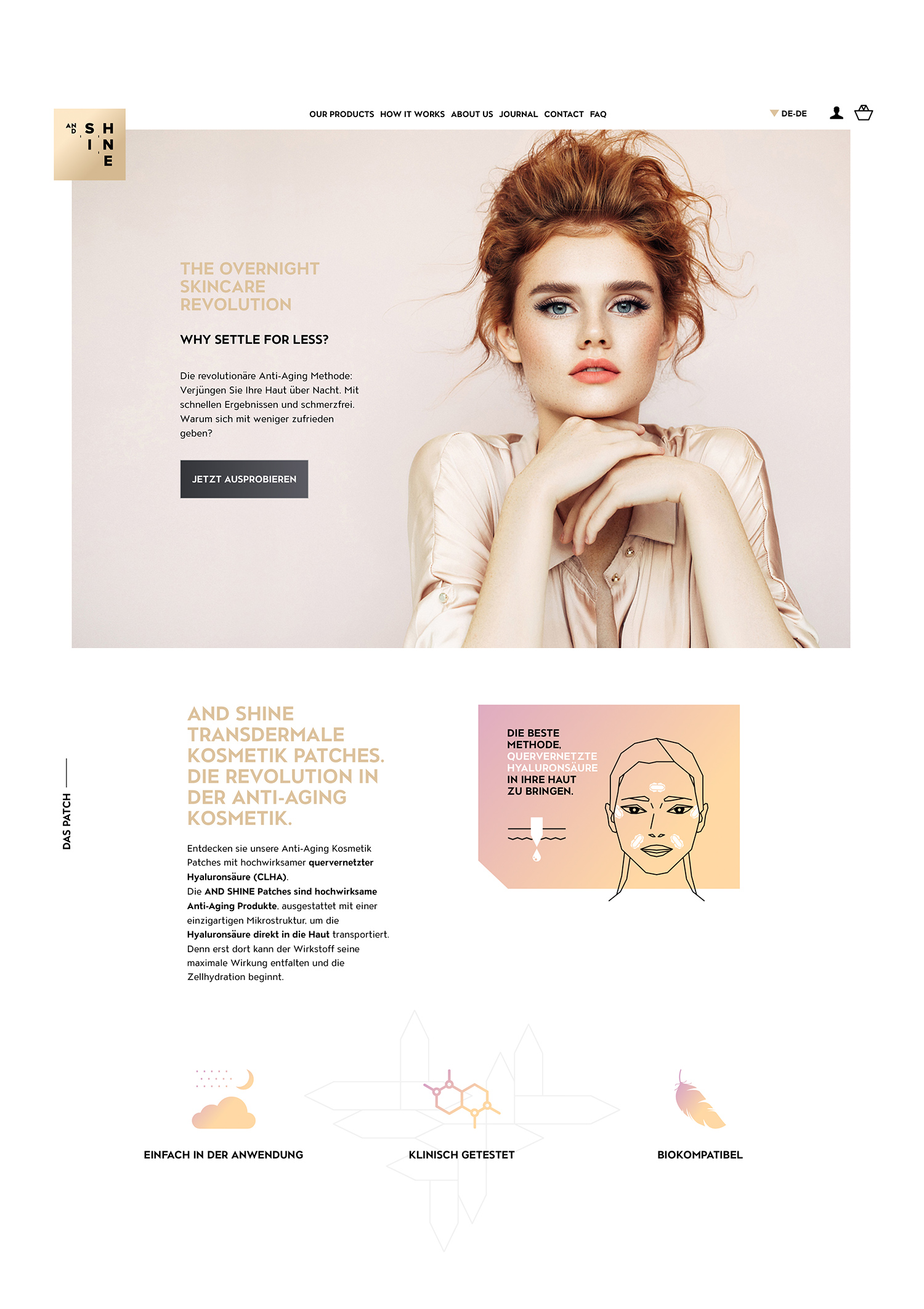 AND SHINE is a startup brand from Munich entering the cosmetic market. The goal is to introduce revolutionary technologies that bring back beauty and healthy skin. Anakin was hired to help building a strong brand by developing a Corporate Identity, fresh Packaging, Website and Overal Visual strategy. The first product is a Transdermal Cosmetic Patch equipped with microneedles to fuel the skin with Cross-linked-Hyaluronic-Acid.