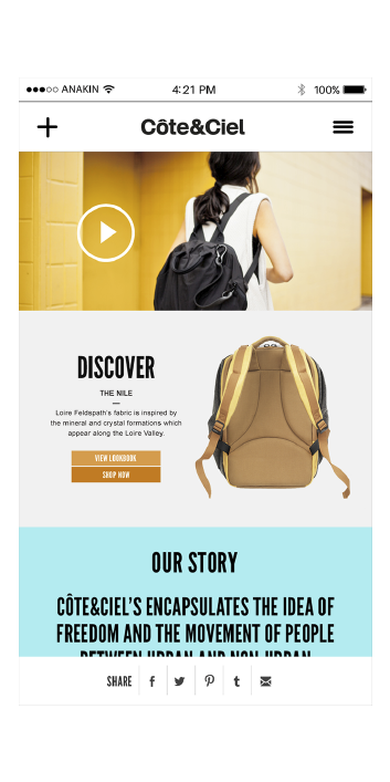 Côte&Ciel is an homage to the productive collision of forces you’ll find at the meeting point between coast and sky. A parisian lifestyle accessory brand focusing on travel bags and gadget carry goods. Anakin has been a partner since day one from working on the idea of a zipper less sleeve over international video shoots up until a world wide ecommerce platform with distribution hubs in the Emericas, Europe and Asia.