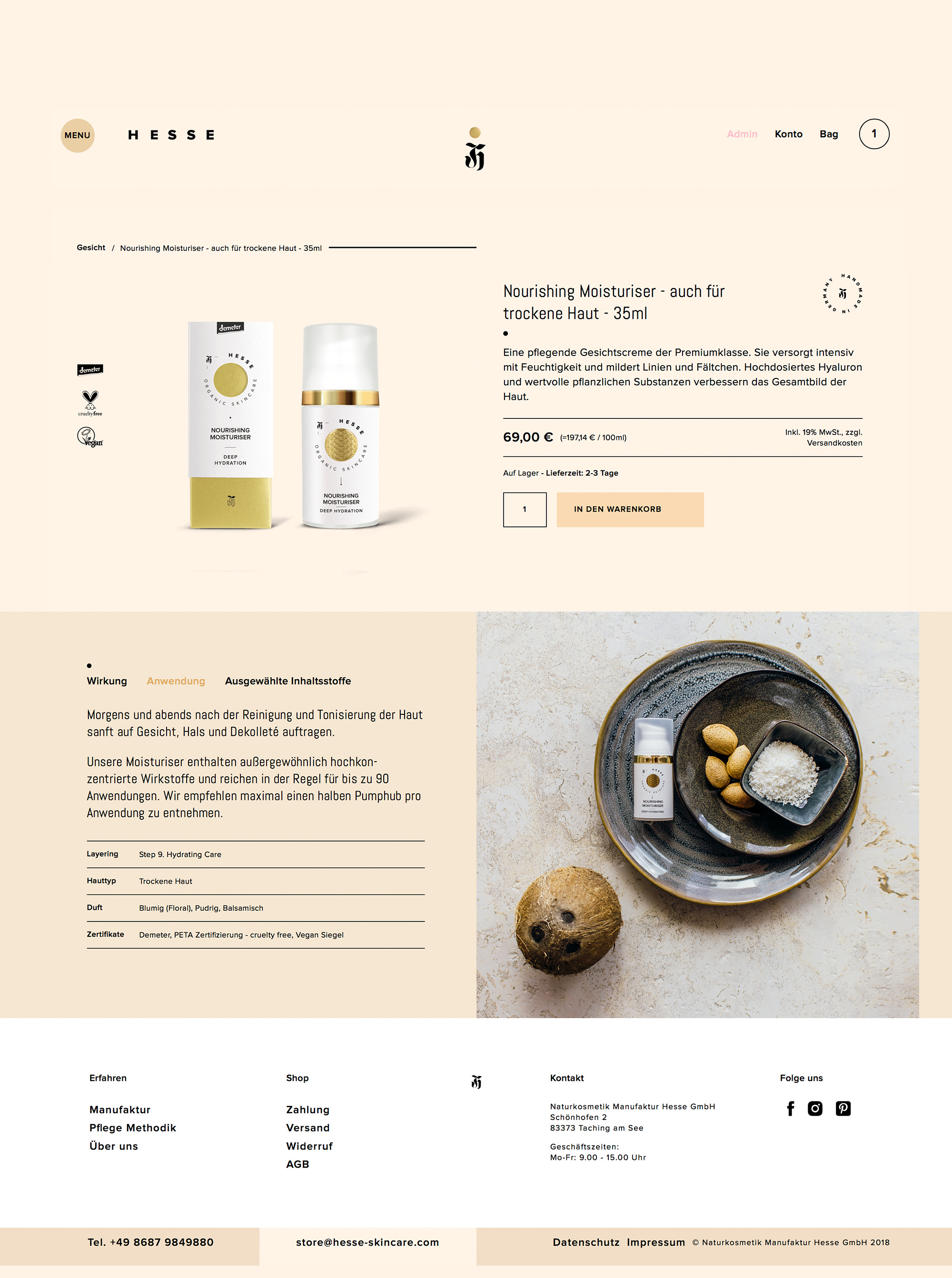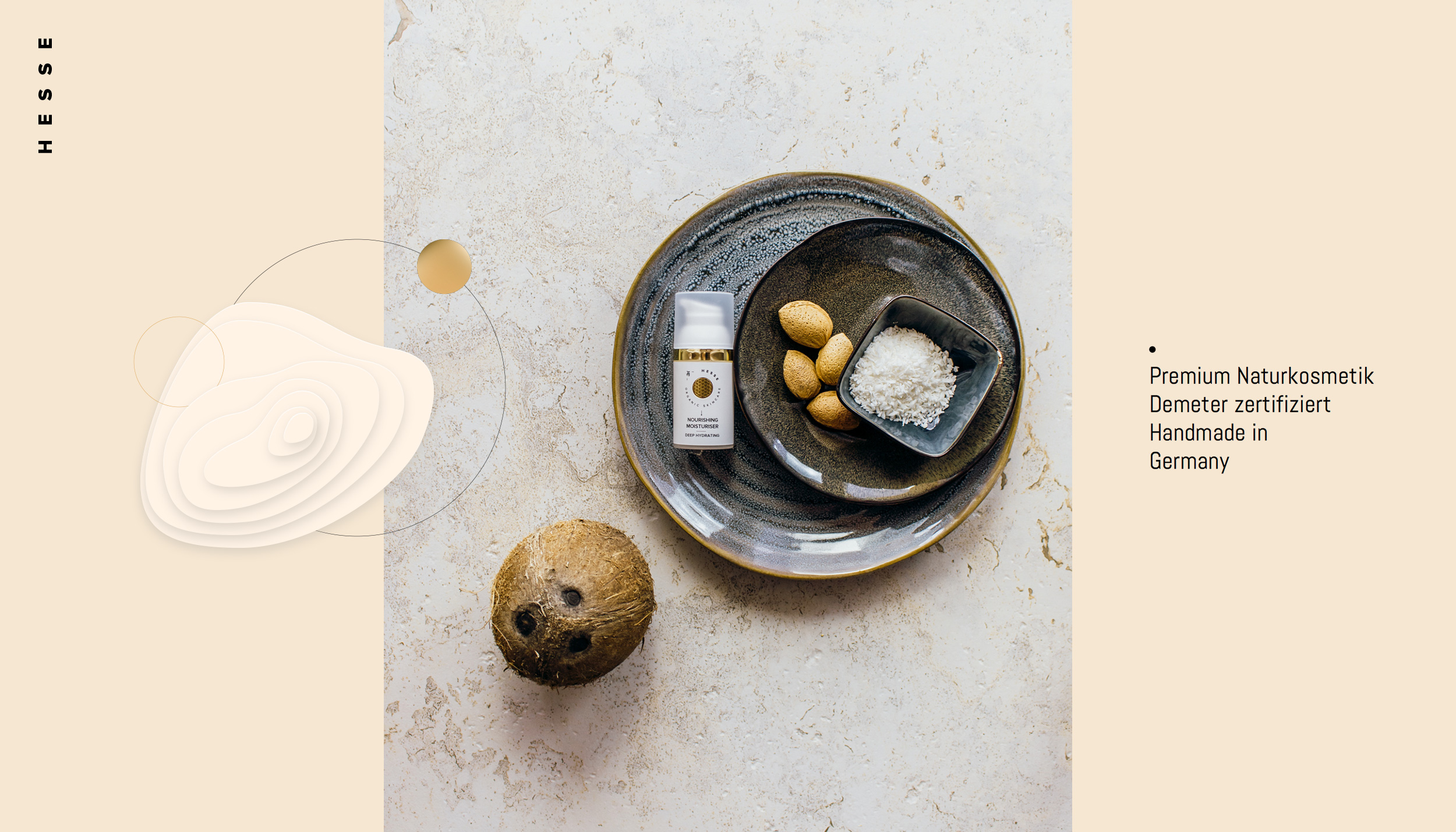 Great Productshots and effectful packaging can only give a glimpse of the oustanding quality of Hesse Skincare products. To give customers more insight into ingredients and context, we created emotional Image Photography to preview the experience that customers will have when touching, smelling and feeling the product.